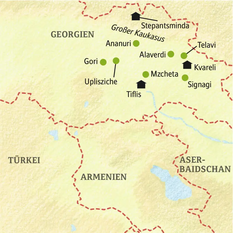 Höhlenstädte erkunden. Im Morgenlicht den Kaukasus begrüßen. Beim Weinbauern einkehren und seine Lieblingstropfen testen: In kleiner Gruppe lässt sich Georgien am besten entdecken! Wir wandern über hügelige Altstadtgassen durch Tiflis und probieren uns im Bergdorf Stepantsminda an der Zubereitung von Chinkali, Georgiens Leibspeise! Freuen Sie sich auf stimmungsvolle Boutique-Hotels – stilvoll, mit viel Wohlfühlfaktor und immer nah dran am Geschehen.