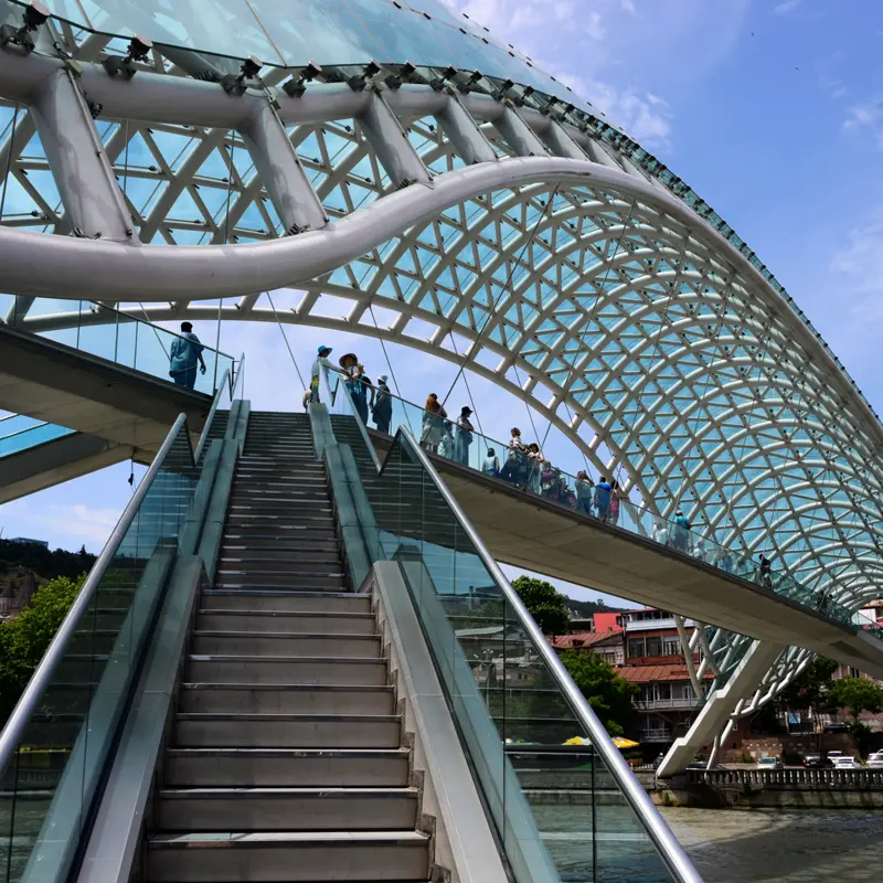 Weinumrankte Terrassenhäuschen neben schicken Einkaufsstraßen, verblichener Jugendstil neben modernen Glasfassaden – Tiflis' Architektur spiegelt die wechselvolle Geschichte der Stadt wider. Unsere gemeinsame Entdeckungsreise führt über hügelige Altstadtgassen. Wer "Das achte Leben" von Nino Haratischwili gelesen hat, erkennt viele Ecken wieder. Über die Festung spazieren wir zum Historischen Museum. Wie kunstvoll die Goldschmiedearbeiten in der Schatzkammer sind! Mondäner Blickfang auf der Straße: die Bauten am Rustaweli-Prospekt. Diese Eindrücke lassen wir erst mal sacken. Wer mag, legt sich dazu in Tiflis' berühmte Schwefelbäder (Eintritt ca. 25 €). (F)