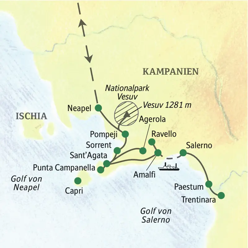 Göttliche Wege über der Amalfiküste, ein Staraufgebot an Naturschauspielen rund um die Halbinsel von Sorrent und erstklassige Kultur-Highlights von Pompeji bis zu den Tempeln von Paestum - das alles bietet diese zehntägige Wanderreise an den Golf von Neapel. Wir wandern abseits touristischer Pfade auf dem Vesuv, meist in den Bergen hoch über der Küste und in einer Schlucht im Cilento. Wer mag, nimmt auch an der aussichtsreichen Küstenwanderung auf der Insel Capri teil. Wir genießen Dolce Vita in Ilarias kleinem Paradies und bei köstlichem Büffelmozzarella auf einem Bauernhof. Und zum Relaxen: Ruhe in einem Hotel in einem ruhigen Ort abseits des Trubels von Sorrent, am Meer in Paestum und Zeit für Aperitivi auf der Piazza - bellissimo!