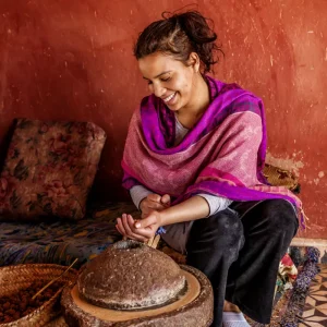 Bäuerin Khadischa und Kolleginnen ihrer Frauenkooperative zeigen uns, wie sie Arganöl pressen – eines der exklusivsten Öle der Welt – und der Landflucht im Süden Marokkos trotzen. Nach der Mittagspause in Agadir kehren wir dem Atlantik den Rücken und die spektakuläre Berglandschaft spielt die Hauptrolle, wenn sich unser Bus langsam in Richtung Tafraoute in den Antiatlas windet. 420 km. (F, A)