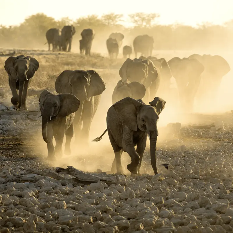 Wir klettern früh in unseren Safaribus, denn wir wollen dabei sein, wenn die Tierwelt im Etoschapark erwacht. Kameraakkus aufgeladen? Mit Sicherheit werden Ihnen Springböcke, Zebras, Gnus und Giraffen vor die Linse laufen. Ihr Reiseleiter nimmt aber auch die Fährte von Löwen und Leoparden auf – damit Sie mit ein bisschen Glück Ihr ganz persönliches Foto des Jahres schießen können. (F, A)