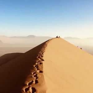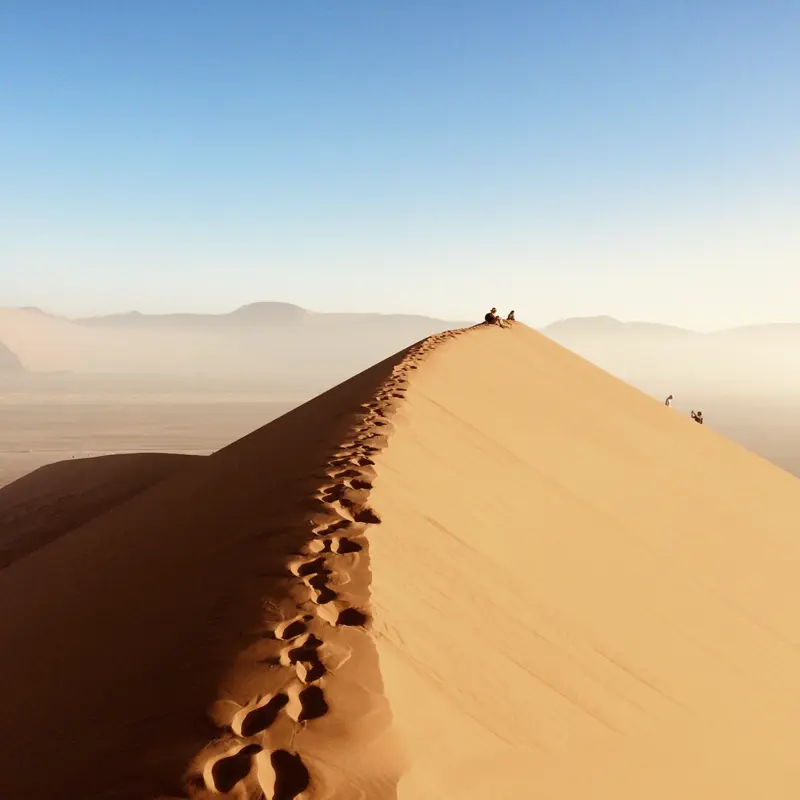 Frühmorgens nehmen wir Kurs auf die zentrale Namibwüste. Höhere Sandberge gibt es nirgendwo auf der Welt: Bis zu 300 m ragen die Dünen rund um die riesige Lehmpfanne des Sossusvleis orangerot in den blitzblauen Himmel. Für mehr Weitblick können Sie nach Lust und Laune einen der Sandriesen besteigen. Gegen Mittag kehren wir zur Lodge zurück. Wer gerne im Pferdesattel unterwegs ist – unsere Lodge bietet Ausritte in die Wüste an. Lust auf eine Jeeptour zum Sonnenuntergang am freien Nachmittag? (F, A)