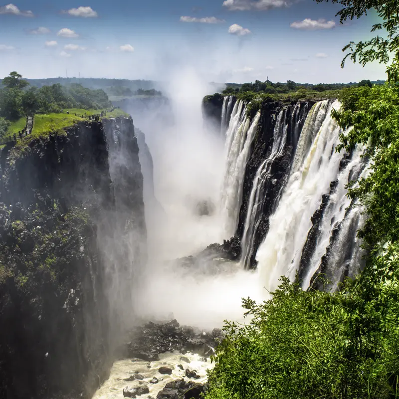Ein Tagesauftakt mit Getöse: Bis zu 10000 Kubikmeter Sambesiwasser rauschen je nach Jahreszeit pro Sekunde in die Tiefe. Als Missionar und Forscher David Livingstone die Königin der Wasserfälle entdeckte, benannte er sie nach seiner Queen: Victoria. Bis heute ein Naturspektakel, das niemanden kalt und schon gar nicht trocken lässt (UNESCO-Welterbe). Gischtwolken vernebeln feuchtfröhlich unseren Wasserfallspaziergang und ergänzen die morgendliche Dusche. Nachmittags ist Zeit zum Ankommen in Afrika, oder Sie gehen in die Luft und betrachten bei einem Rundflug die Wasserfälle von oben. (F, A)