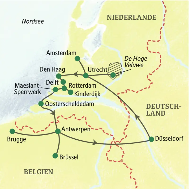 Windmühlen und Tulpen, Pommes frites und Bier machten die Niederlande und Belgien berühmt. Doch die wahre Seele der beiden Länder zieht sich durch Grachten und Kanäle, spiegelt mittelalterliche Flussmetropolen und moderne Hafencitys: das Wasser. Auf dieser Studiosus-Reise erfahren wir, wie man mit dem Wasser lebt – und es zügelt. Im Bus unterwegs zu den größten Highlights zwischen Utrecht und Brüssel: Tauchen Sie in Amsterdam und Antwerpen in das Werk großer Künstler wie Rubens und Rembrandt ein, wandeln Sie in Den Haag auf weltpolitischem Parkett und erleben Sie romantische Grachtenidylle in Brügge!