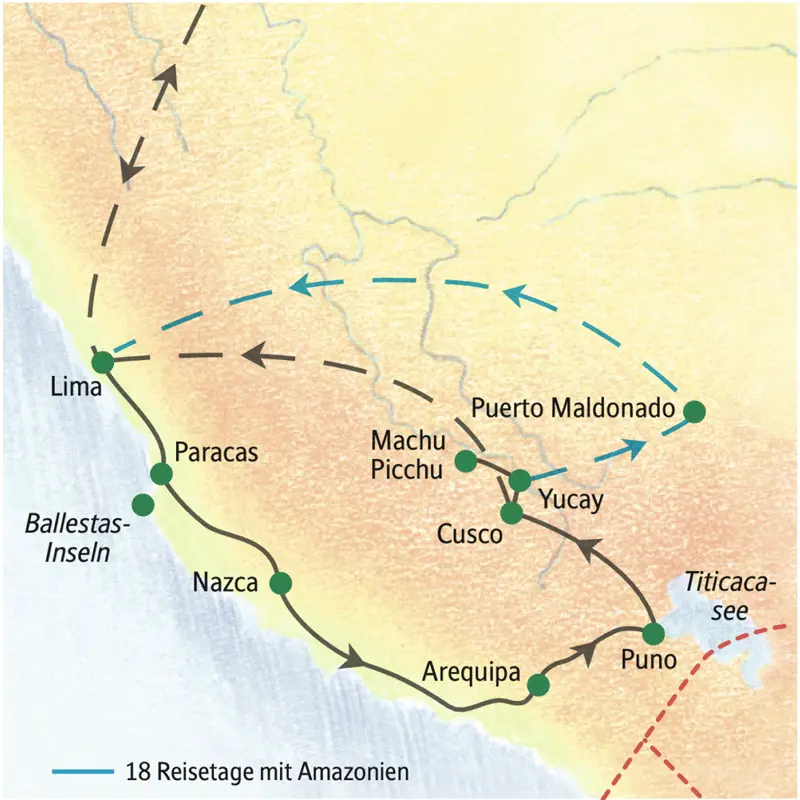 Auch wenn Sie schon unzählige Bilder im Kopf haben – live macht der heilige Inkaort Machu Picchu einfach sprachlos! Doch der Andenstaat hat noch viel mehr zu bieten: pulsierendes Großstadtleben in Lima, Kolonialflair in der alten Inka-Hauptstadt Cusco. Zwischen Pazifikküste, Küstenwüsten, dem tiefblauen Titicacasee, kargen Hochebenen und schneebedeckten Andengipfeln entfaltet Peru außerdem sein grandioses Landschaftsspektrum. Eine kompakte Studiosus-Reise, die alle Höhepunkte des Landes vereint. Und für Tauchgänge ins Alltagsleben – inklusive kulinarischer Kostproben – und Entdeckungen in Eigenregie bleibt auch noch Zeit.