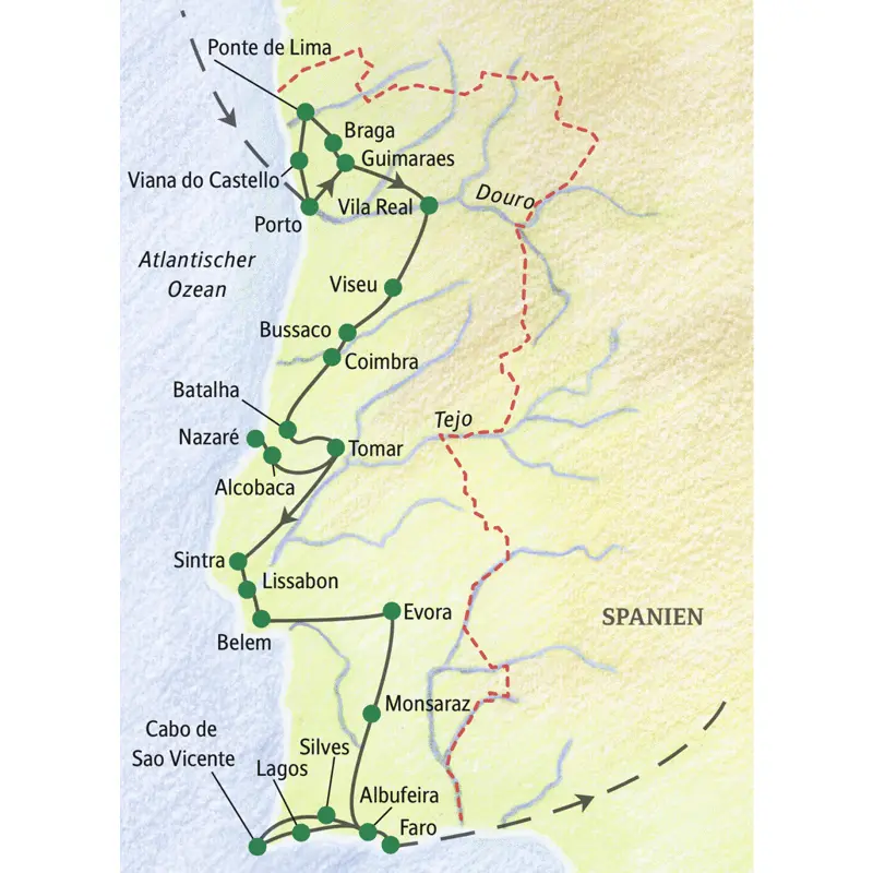 Portugal im gemächlichen Takt des Südens genießen? Mit vielen Mehrfachübernachtungen und komfortablen Hotels? Eine herrliche Idee. Entdecken Sie Porto und Lissabon mit Zeit zum Schlendern. Reisen Sie an Orte mit bewegter Geschichte: die Burg der Tempelritter in Tomar und das Zisterzienserkloster Alcobaca. Lassen Sie sich viele Jahrhunderte zurückversetzen an der Universität von Coimbra und in der weißen Stadt Evora. Tauschen Sie sich mit Winzern aus und kosten Sie ihre Spezialitäten. Bestaunen Sie die edlen Lusitanopferde auf einem Traditionsgestüt! Weinberge und Korkeichenwälder, Steilklippen und Traumstrände – Portugal wird Ihr Herz in aller Ruhe erobern.