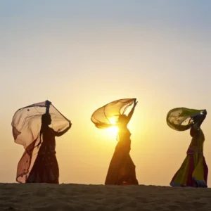 Ein bisschen Sitzfleisch ist hilfreich auf unserem Weg nach Westen. Dann flimmert uns plötzlich eine honiggelbe Festung (UNESCO-Welterbe) aus Sandstein entgegen. Nein, keine Fata Morgana – die Oasenstadt Jaisalmer! 330 km. Vor den Toren der Stadt kennt Ihr Reiseleiter den besten Fotoplatz und reicht Ihnen schon mal einen Sundowner. Die Sonne sinkt tiefer und tiefer und vergoldet Jaisalmers 99 Bastionen, während Musiker das Farbschauspiel mit rhythmischen Klängen untermalen. Zwei Übernachtungen in Jaisalmer. (F, A)