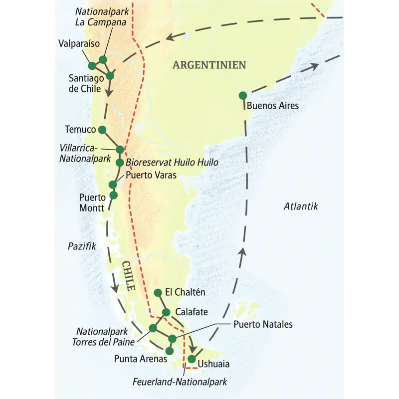 Wie eine große Komposition präsentiert sich diese Wanderreise durch Chile und Argentinien. Folgen Sie dem Rhythmus von Santiago de Chile und dem Lockruf der Natur. Erwandern Sie sich Landschaften, die jede Opernkulisse in den Schatten stellen: rauchende Vulkane und von Schnee gekrönte Berglegenden, tosende Wasserfälle und unter Donnergrollen kalbende Gletscher. Tauchen Sie ein in den Alltag des indigenen Volkes der Mapuche und begegnen Sie deutscher Lebensart in der Chilenischen Schweiz. Eine Sinfonie aus Wolken erwartet Sie in der Patagonischen Steppe, eine ohrenbetäubende Stille am Ende der Welt. Leise führt sie uns zum Grand Finale, bevor Musik gewordene Sehnsucht Sie zum letzten Tango in Buenos Aires begleitet.