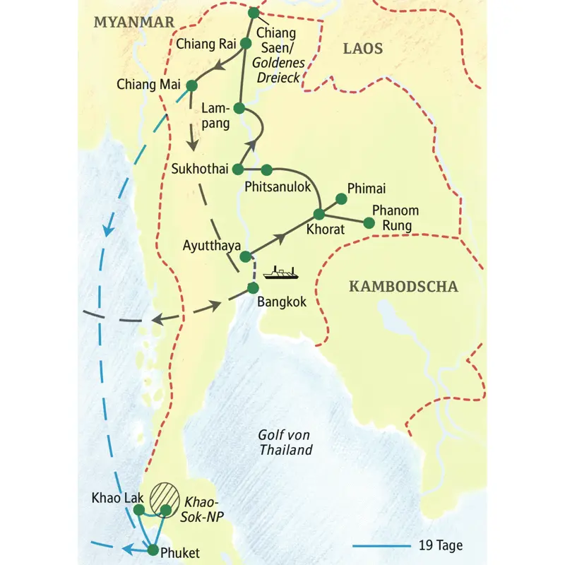 Sabai, sabai – das bedeutet in Thailand: genießen, entspannen, sich rundum wohlfühlen. Das wird Ihnen nicht schwerfallen im "Land des Lächelns". Natürlich sollen Sie Ihre Neugierde stillen – von der Boomtown Bangkok über die alten Königsstädte bis zu den goldenen Tempeln und den stillen Landschaften des Nordens zeigen wir Ihnen lauter Höhepunkte. Aber auch die Sinne werden gekitzelt: beim Kochkurs in Chiang Mai, bei einem Konzert junger Musiker oder einer Zeremonie im Tempel. Bei der 19-tägigen Reise erleben Sie zusätzlich den Süden Thailands zwischen dem tropischen Khao-Sok-Nationalpark und den Traumstränden von Khao Lak. Und ganz bestimmt reisen Sie mit einem Lächeln im Gesicht zurück in die Heimat.