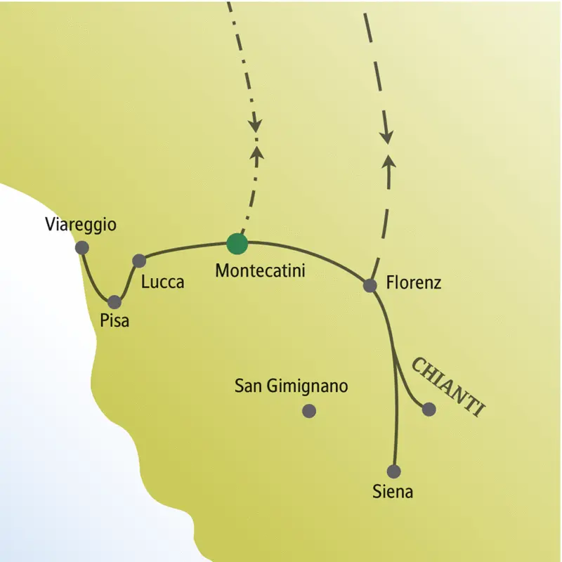 Auf geht's zu den weißen Wundern auf grüner Wiese in Pisa! Nachdem wir dort Dom, Baptisterium, Campo Santo und den Schiefen Turm (von außen) bewundert haben, fahren wir ans Meer in den Strandort Viareggio. Hier herrscht die pure Bade- und Urlaubsstimmung. Zeit für einen Stadtbummel, ein Eis oder einen Spaziergang am Meer. Busstrecke 120 km. Abends nehmen wir die Seilbahn hinauf nach Montecatini Alto, gönnen uns dort unser Abschiedsessen und genießen bei der Rückfahrt den Blick auf das Lichtermeer unter uns. (F, A)