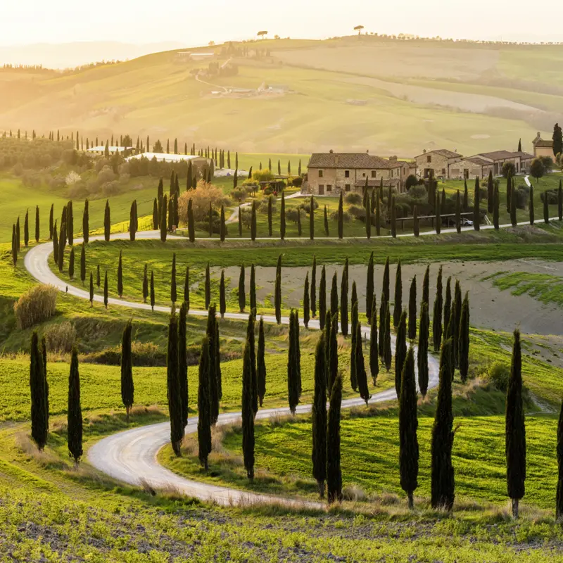 Vom Hotel • wandern wir (2,5 Std., mittel, ↑150 m ↓250 m) auf den "strade bianche", den alten Wirtschaftsstraßen, ins Val d'Orcia (UNESCO-Welterbe). Am Fuße einer eindrucksvollen Burg zwängt sich der Fluss durch sein enges Tal, lässt uns aber genug Platz für den Weg zu den Sinterterrassen von Bagno Vignoni. Für das Picknick mit Fenchelsalami und Pecorino kennt Ihre Reiseleiterin den passenden Ort: die fotogen in der Landschaft gelegene roman(t)ische Abtei Sant'Antimo. 50 km. Und beim Abendessen in einem Restaurant in San Quirico heißt es dann schon Abschied nehmen von der Toskana - aber nicht, ohne es uns noch einmal so richtig gut schmecken zu lassen! (F, A, P)
