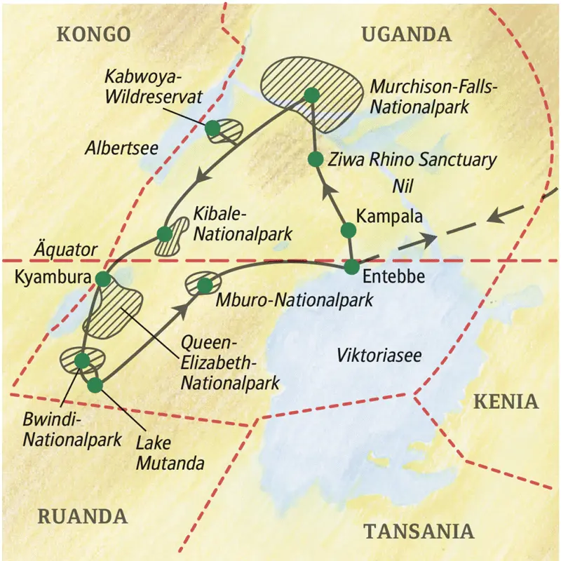 Begleitet vom Knacken, Zirpen und Zwitschern der Savanne streifen wir zu Fuß mit einem Ranger durch den Nationalpark. Versteckt sich dort drüben eine Antilope? Auf der Fahrt nach Entebbe überqueren wir den Äquator. Die traditionelle Äquatortaufe zelebriert Ihre Reiseleiterin. In Entebbe essen wir in einem guten Restaurant am Victoriasee noch einmal zu Abend. Wir schwelgen in Erinnerungen, tauschen Erlebnisse und Adressen. Dann heißt es Abschied nehmen. Kurz vor Mitternacht Rückflug mit Brussels Airlines (nonstop, Flugdauer ca. 8 Std.). (F, A)