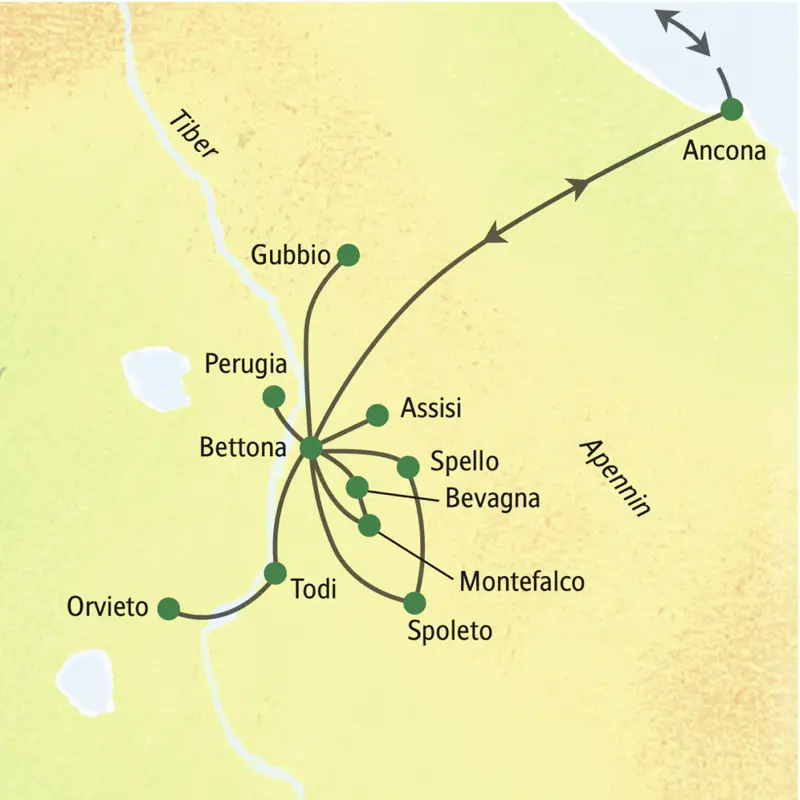 Bahnanreise 1. Klasse zum Flughafen und Flug nach Ancona. Gegen 13 Uhr schweben Sie ein und werden von Ihrem Studiosus-Reiseleiter herzlich empfangen. Gemeinsam überqueren wir mit unserem Bus in sanften Schwüngen die grünen Berge des Apennins und erreichen Bettona in Umbrien. 130 km. Ein erster Spaziergang durch den mittelalterlichen Ort, und unsere Blicke schweifen über die sanften Hügel und Täler der Umgebung - die perfekte Einstimmung auf unsere Woche in Umbrien. Den kulinarischen Auftakt bilden beim Abendessen im Hotel erste typische Spezialitäten wie Wildschwein oder Steinpilze. Sieben Übernachtungen in Bettona. (A)
