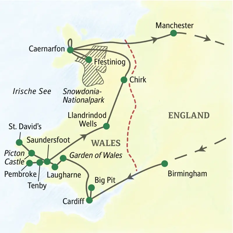 Grün, manchmal schroff, von keltischer Abstammung und doch modern und immer herzlich - auf dieser Reise nach Wales werden Sie viele Facetten dieses Landes kennenlernen. Natur, Geschichte und nicht zuletzt die Menschen stehen dabei im Fokus. Sie entdecken grüne Hügelketten, einsame Küstenstriche und suchen in alten Festungen nach Spuren der Geschichte. Wie Wales zum Motor der industriellen Revolution wurde, erfahren Sie auf unserer Fahrt mit einer alten Dampflok und in Cardiff, dem modernen Zentrum des Landes mit seinen Millenniumsprojekten. Lieben die Untertanen ihren Prince of Wales? Finden Sie es heraus bei einem Pint im Pub!