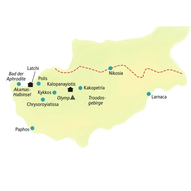 Reichlich frische Bergluft gibt es auf unserer dreistündigen Wanderung (mittel) im Schatten von Schwarzkiefern und Wacholderbüschen rund um den zypriotischen Olymp, den höchsten Gipfel der Insel. Tolle Panoramablicke bis zur Küste inklusive. Wer nicht in Wanderlaune ist, nutzt die Möglichkeit, per Hotel-Mountainbike auf eigene Faust das Marathasatal zu erkunden. Am freien Nachmittag können Sie in den Relaxmodus schalten. Ein Dorfspaziergang oder lieber Verwöhnprogramm im Spa? Wie es Ihnen gefällt! Vor dem Abendessen noch Lust auf ein exklusives Kinoerlebnis im Hotel? Der Film "Akamas" erzählt berührend die wahre Geschichte einer schwierigen Liebe im Spannungsfeld der Inselpolitik. Weitere Hintergründe zum Film werden wir später erfahren ... (F, A)